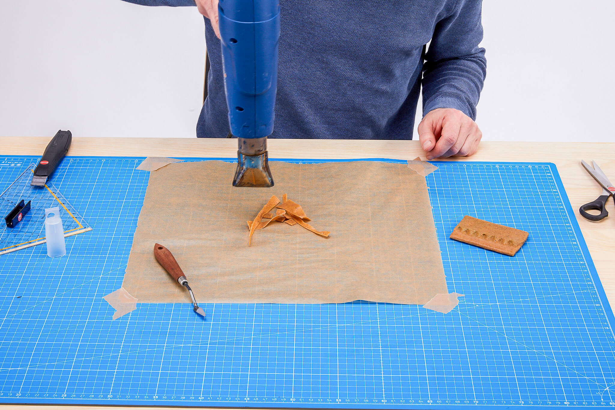 Während Worbla, Thibra und Formcard in Plattenform angeboten werden, kannst Du das aus der Medizintechnik stammende Varaform als Rollenmaterial bekommen. Varaform besteht aus einem Baumwollgewebe, das von einem Kunstharz umschlossen ist. Diesem thermoplastischen Kunstharz wird die biologische Abbaubarkeit zugesprochen. Aus drei verschiedenen Maschenweiten kannst Du wählen und damit feiner oder gröber Formen abnehmen oder frei gestalten. Bei 70 °C ist das Material am besten formbar, ohne zu kleben. Erwärmst Du es darüber hinaus, wird es klebrig. Mit diesen Eigenschaften kannst Du gut arbeiten, denn Varaform lässt sich beispielsweise mit dem Heißluftfön bereichsweise in den klebrigen Bereich erwärmen, damit Du es dort mit anderen Teilen verbinden kannst. Verwende am besten beim Abformen dünne feuchte Tücher oder andere dünne Trennschichten zwischen Original und Varaform, damit nicht versehentlich das Material mit dem Original verklebt. Darüber hinaus empfehlen wir bei allen Arbeiten mit allen in diesem Artikel genannten Materialien eine Unterlage aus Silikon auf dem Tisch zu verwenden. Sie ist temperaturunempfindlich und auf ihr haftet kein klebriger Thermoplast.