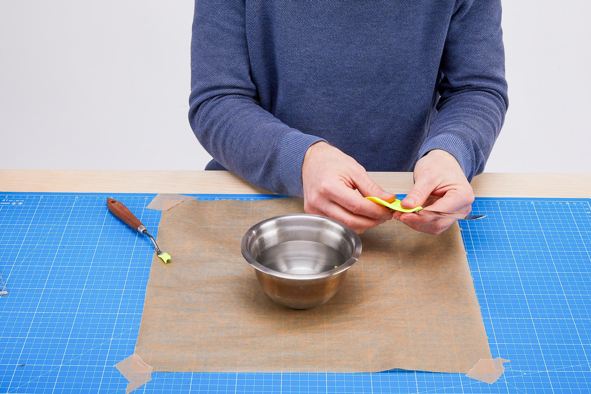 In unserem Sortiment ist Thibra Pearl der formbare Thermoplast, der die niedrigste Umformtemperatur braucht. Bereits bei 60 °C geht das Formen des Polyurethan-Elastomers los. Gut zu kontrollieren ist die Temperatur beispielsweise im Wasserbad, das zum Aufheizen des Materials genutzt werden kann. Die Perlen (bzw. das Granulat) werden oberhalb von 60 °C zusammengeknetet, wobei eine homogene Modelliermasse entsteht, die Du von Hand, aber auch mit Hilfe von Modellierwerkzeugen, in die gewünschte Form bringen kannst. Und wenn das Material abkühlen sollte, bevor Du fertig bist mit dem Formen, erwärmst Du es einfach erneut – so oft Du willst.