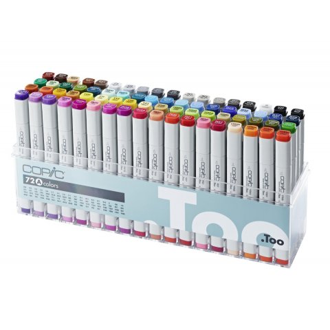 Los tres juegos de 72 sólo se solapan en los colores 100 (negro) y 110 (negro especial), que están incluidos tanto en el juego de 72 A como en el juego de 72 B. Los colores 100 (negro) y 110 (negro especial) sólo se solapan en los tres juegos de 72. Con la compra de los tres juegos de 72 se compran todos los colores Copic Marker en una versión simple y sólo los colores 100 y 110 dobles. Por favor, consulte la siguiente tabla para la composición de los juegos.
